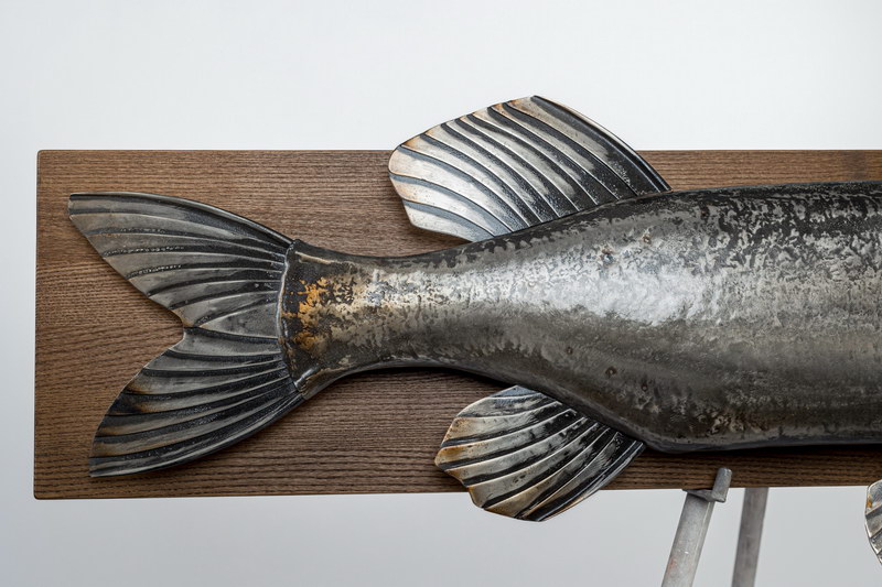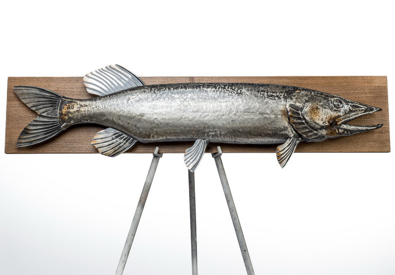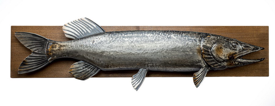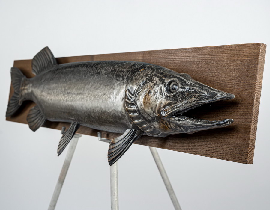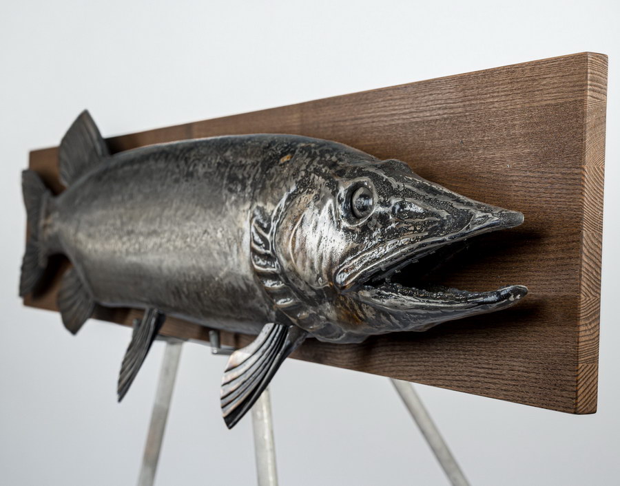 В стремительном изгибе этого металлического хищника застыла сама суть дикой природы. Щука авторства художника Виталия Смыслова – настоящий гимн стихии и охоты. За данным изделием стоит огромный пласт творческого опыта и профессионального становления мастера, чей путь начался более 30 лет назад. В щуке, которую Вы видите перед собой, главным инструментом для создания неповторимой скульптурной формы служит кузнечная техника исполнения.